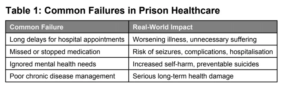 - Lack of Transparency: We do not publish comparable data on prison healthcare waiting times the way we do for the community. Without this, a systemic problem is easily dismissed as isolated bad luck.